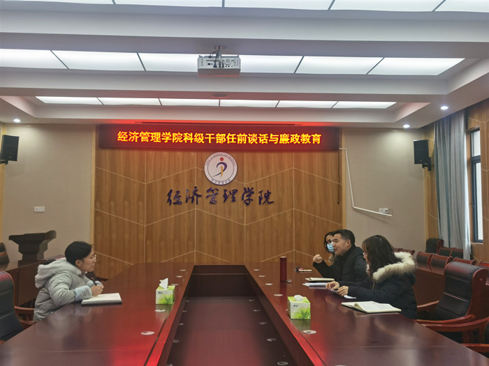 12月18日上午,十大买球投注网站在横江校区行政楼会议室召开十大买球投注网站召开科级干部任前谈话与廉政教育会议,学院党委书记胡永政、纪委委员方微、教工党支部书记邱燕、秘书江红以及新任科级干部杨静荣参加任前谈话与廉政教育会议,会议由胡永政主持。