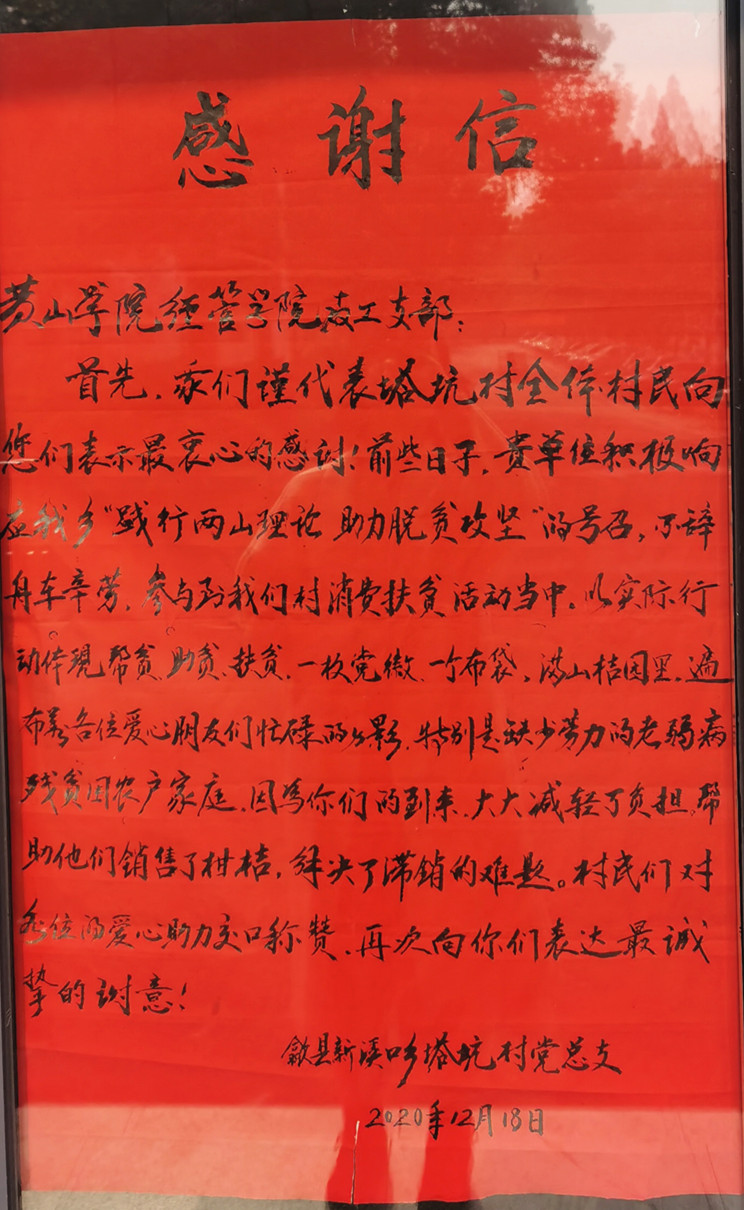 感谢信称,十大买球投注网站教工党支部积极响应中央国务院和省委省政府“践行两山理论、助力脱贫攻坚”的号召,积极深入塔坑村贫困户家庭采摘柑橘助力扶贫活动,以实际行动帮贫、扶贫、助贫,缓解了贫困户家庭柑橘滞销压力,助力贫困户家庭增收脱贫,为今年塔坑村决胜脱贫攻坚做出了贡献。塔坑村村民对十大买球投注网站教工党支部组织扶贫善行交口称赞,深表谢意。