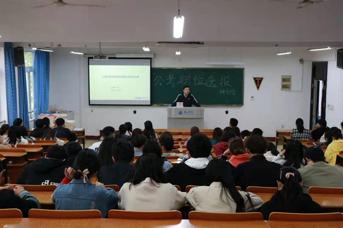 4月7日下午,十大买球投注网站在横江校区1301教室举办公务员职位报考指导讲座,特邀中博教育公考项目部指导老师周磊作为主讲人,学院百余名学生参加此次讲座。