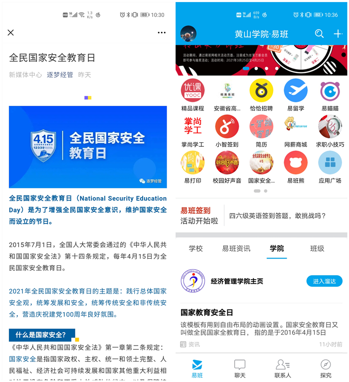 据悉,该院结合易班网、“逐梦经管”微信公众号、QQ新媒体等网络思政教育平台,线上线下深入开展安全国家教育专题学习。旨在全院师生心中牢固树立总体国家安全观,以实际行动维护和塑造国家安全稳定环境。