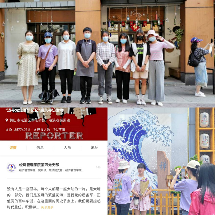 经过前期精心策划、认真准备,最终选定9个小组,每组均由四支部党员带队,共计79人参与活动。活动过程中学生党员统一佩戴党员徽章,与积极分子们一道礼貌热情地邀请路人参与采访,用镜头记录下普通群众对党的了解和对建党一百周年的美好祝福。同时,积极向大家普及党史的相关小知识,进一步交流革命先辈艰苦奋斗的伟大精神。一位被采访的黄山市民动情的表示:“没有中国共产党就没有现在美好的生活,相信共产党定能不忘初心,牢记使命,继续为人民的幸福谋福利”。