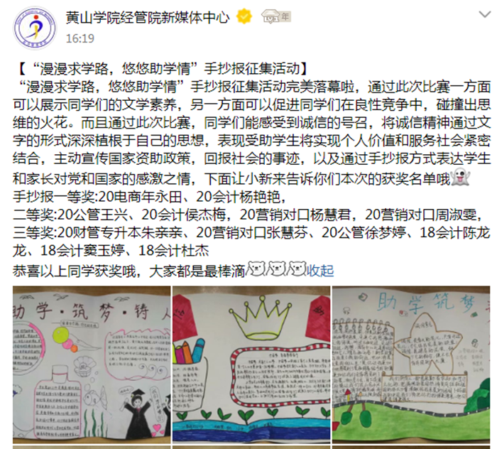 该院成功举办了“漫漫求学路,悠悠助学情”为主题的手抄报征集活动,通过手抄报的形式表现出受助学生将实现个人价值和服务社会紧密结合,宣传国家资助政策,表达对党和国家的感激之情。