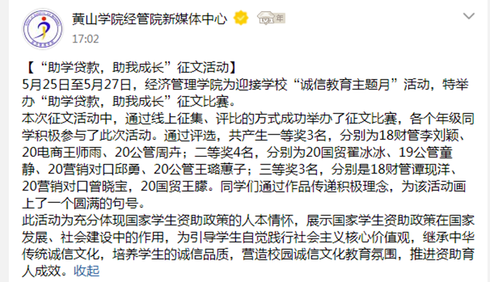 该院成功举办了学生资助诚信教育征文比赛,学生在作品中讲述了自立自强的励志事迹,表达了对党和国家的感激之情,展现了端正的学习态度和积极向上的人生态度。经征文评审小组的评选,共产生一等奖3名,分别为18财管李刘颖、20电商王师雨、20公管周卉;二等奖4名,分别为20国贸翟冰冰、19公管童静、20营销对口邱勇、20公管王璐蕙子;三等奖3名,分别是18财管谭现洋、20营销对口曾晓宝,20国贸王朦。