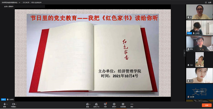 为进一步推进党史教育,充分利用红色教育资源,10月4日,十大买球投注网站开展“品读革命家书,赓续红色精神——我把《红色家书》读给你听”线上红色家书诵读活动。经济管理学院党委委员江红、汪玉玲,教工支部书记邱燕以及200多学生参加此次诵读活动,活动由李鑫同学主持。
