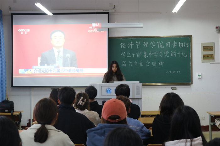 11月19日,十大买球投注网站团委在1107教室组织团学干部集中学习党的十九届六中全会精神,学习会由学院团委学生副书记黄子雯主持。