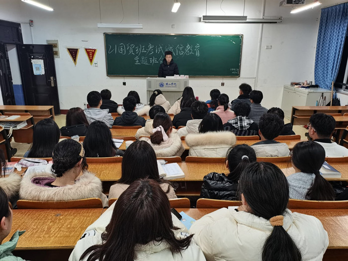 为增强同学们诚信法律意识,弘扬“诚信考试光荣,违纪舞弊可耻”的社会风尚,营造“诚实守信,公平正义”的考试氛围,12月1日21国贸班在1223教室召开了考试诚信教育主题班会,全班同学参加了此次班会。