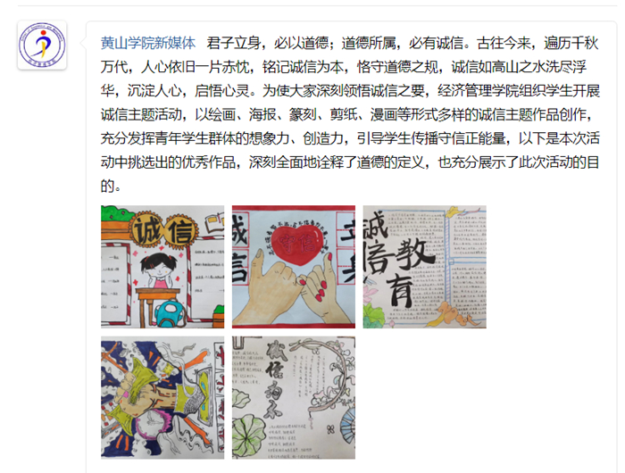 该院成功举办了以绘画、海报、剪纸、漫画等形式多样的诚信主题作品创作,充分发挥青年学生群体的想象力、创造力,引导学生传播守信正能量。通过作品创作的形式表现出受助学生将实现个人价值和服务社会紧密结合,宣传国家资助政策,表达对党和国家的感激之情。