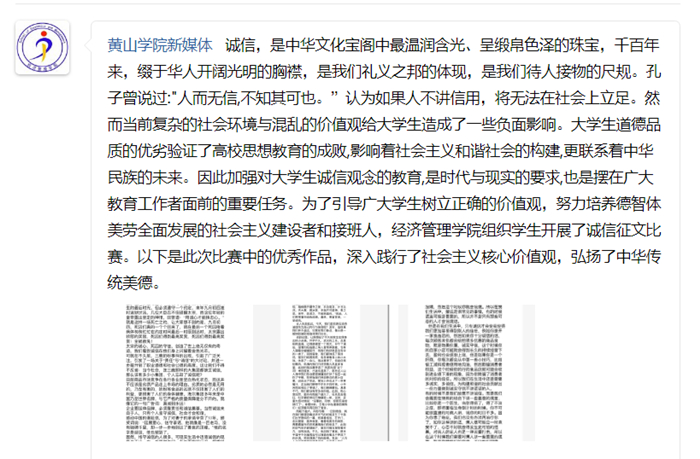 该院成功举办了学生资助诚信教育征文比赛,引导学生自觉践行社会主义核心价值观,做诚信好青年。学生在作品中展现了端正的学习态度以及积极向上的人生态度。经征文评审小组的评选,一等奖21会计班石晓柔;二等奖19财管班牛侠;三等奖21会计班方芳。