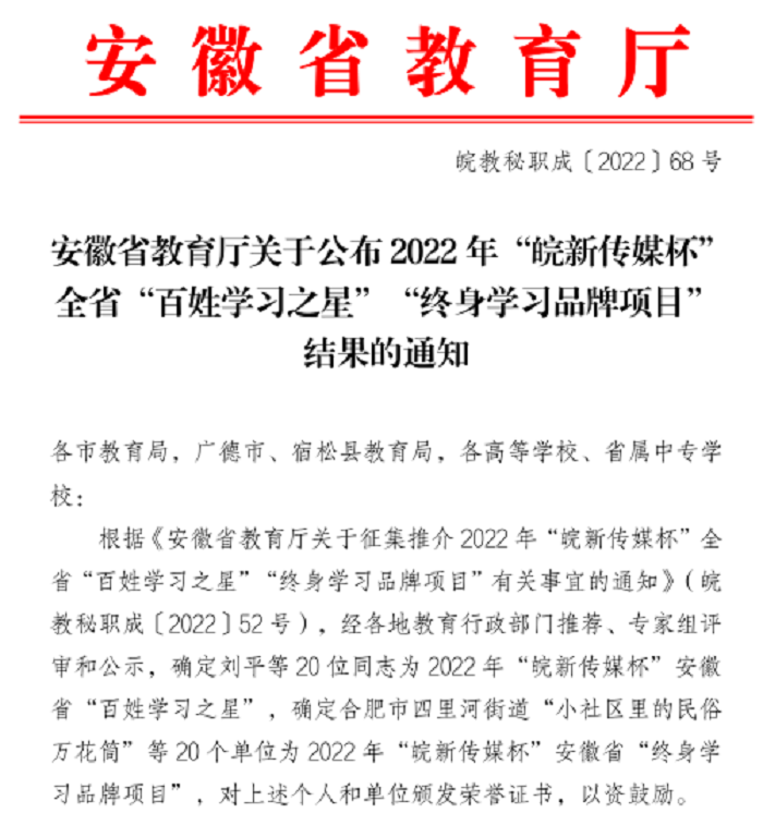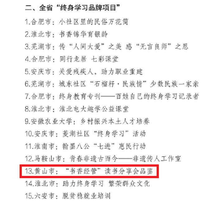 近日,安徽省教育厅下发关于公布2022年“皖新传媒杯”全省“百姓之星”“终身学习品牌项目”的通知。买球官网“书香经管”读书分享会品鉴荣获全省“终身学习品牌项目”。