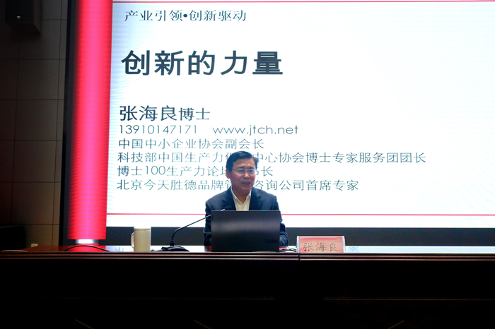 聘任仪式结束后,张海良教授作了题为《创新的力量》专题报告。他从创新创新的概念、创新的本质、创新的顶端设计、创新的前提、创新的保障等十一个方面对产业引领和创新驱动进行了详细阐述。会上,同学们认真倾听,现场氛围轻松活泼。