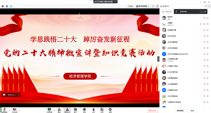 12月16日,十大买球投注网站各学生党支部联合该院团委在线上开展党的二十大精神微宣讲暨知识竞赛活动。该院各学生支部书记、团委副书记李斌、全体学生党员,学生会代表等参加活动。