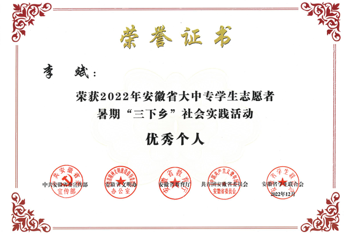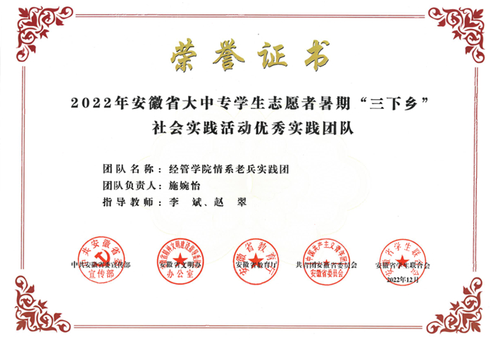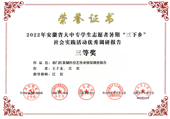 近日,十大买球投注网站情系老兵实践团荣获2022年安徽省大中专学生志愿者暑期三下乡社会实践活动优秀实践团队称号,该院团委副书记李斌荣获省级优秀个人,由学院秘书江红指导的《祁门红茶制作技艺传承情况调查报告》荣获省级优秀调研报告三等奖。