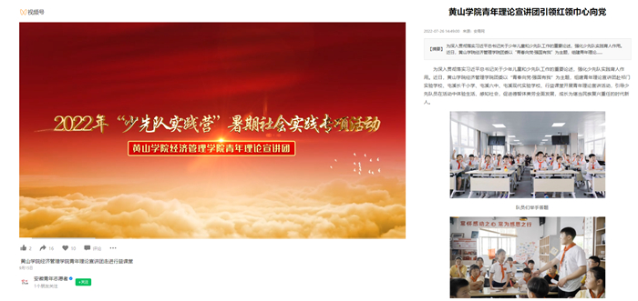 学院党委高度重视实践育人功能,指导学院团委鼓励学院师生积极参加2022年暑期三下乡社会实践活动,该院共立项成立五支队伍:全国重点团队——情系老兵实践团;省级少先队专项实践营——青年理论宣讲团;校级团队——非遗传承调研团和青春战“疫”服务团和返家乡社会实践团。各团队严格遵守属地疫情防控管理,按时按量按质完成既定工作,工作成功显著。学院暑期三下乡活动多次被中国社会报、中国双拥网、中青校园、安徽学联、安徽日报、安徽财经网、安青网、中安在线、黄山日报、黄山在线等各大媒体报道。